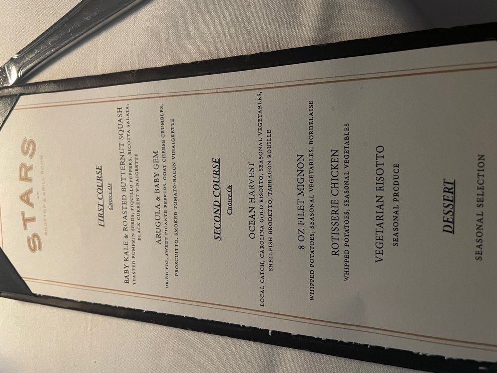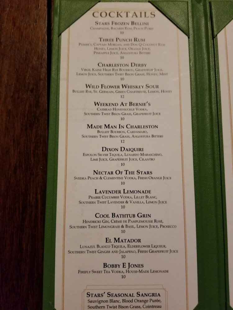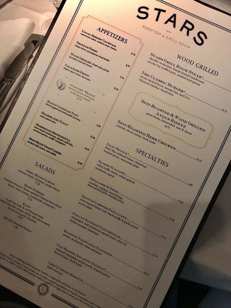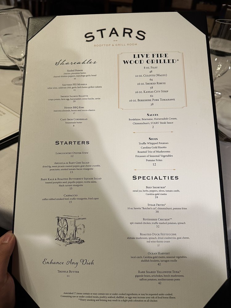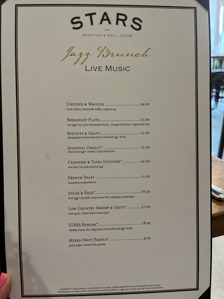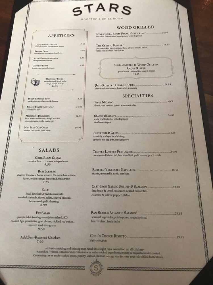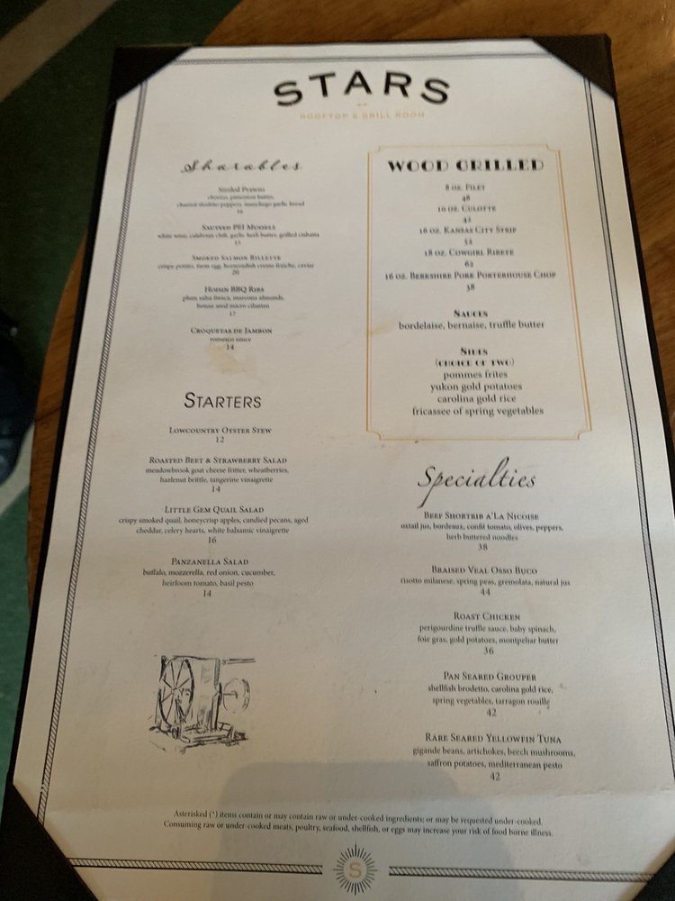Stars Rooftop & Grill Room, located in Charleston, SC, is a vibrant New American bar offering a range of amenities such as outdoor seating, free Wi-Fi, and private dining options. The diverse menu features brunch specialties like Avocado Toast and Stars Pancakes, as well as creative salads like the Acorn Squash Salad and Grilled Caesar Salad. The atmosphere is perfect for weekend nights with happy hour specials, full bar, and live music for dancing. The attention to detail in the dishes, like the Watermelon & Feta and Roasted Pear Radicchio Salad, showcases the chef's commitment to quality and flavor. Stars Rooftop & Grill Room is a must-visit spot for those looking for a unique dining experience in Charleston.
